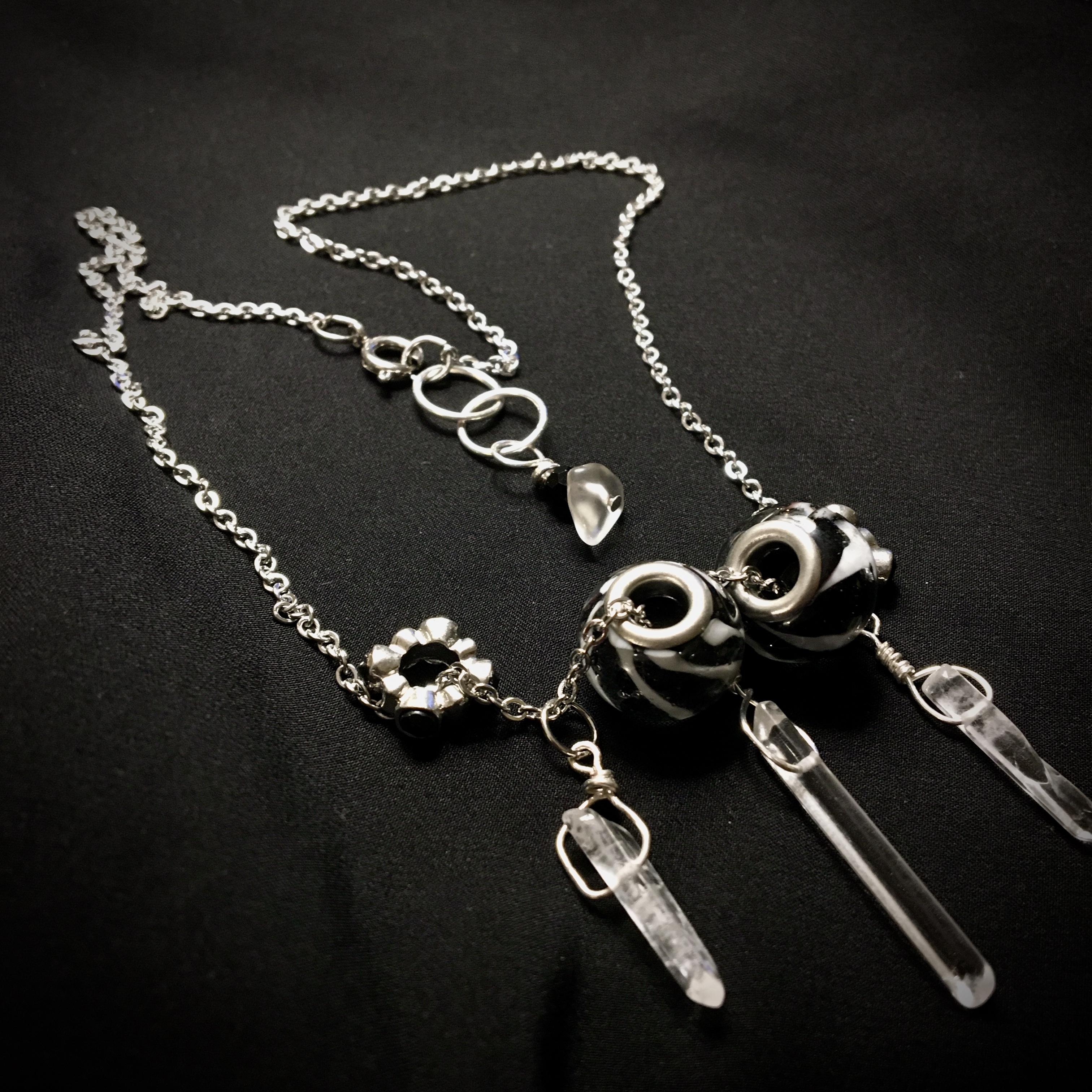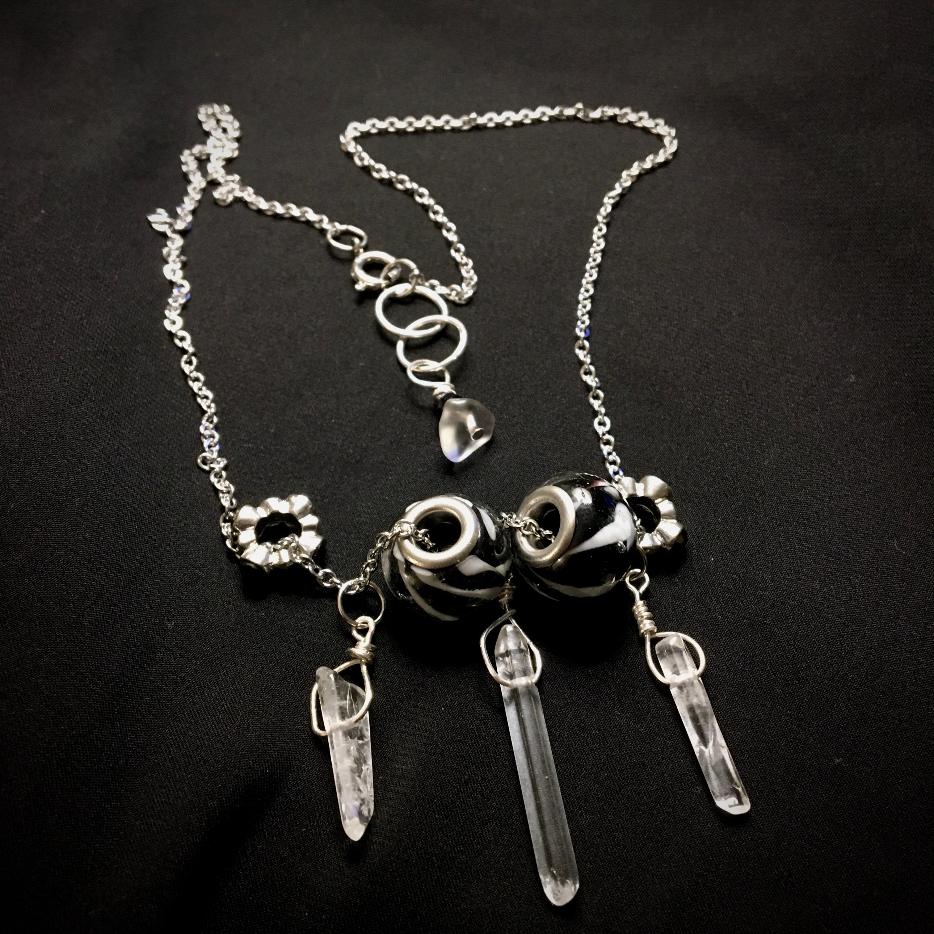Stripes are often associated with decision making and attention to detail. Black and white colors are many times used to represent balance. Stripes as well as the monochrome of black and white can show sure and steadiness♡ The colors of the glass help depict straightforwardness♡Clear quartz is also often used as a clarifying stone, to cleanse and purify. May the clear quartz and monochrome elements of this necklace help bring you stable energy as well as a feeling of confidence and intrepidity♡
