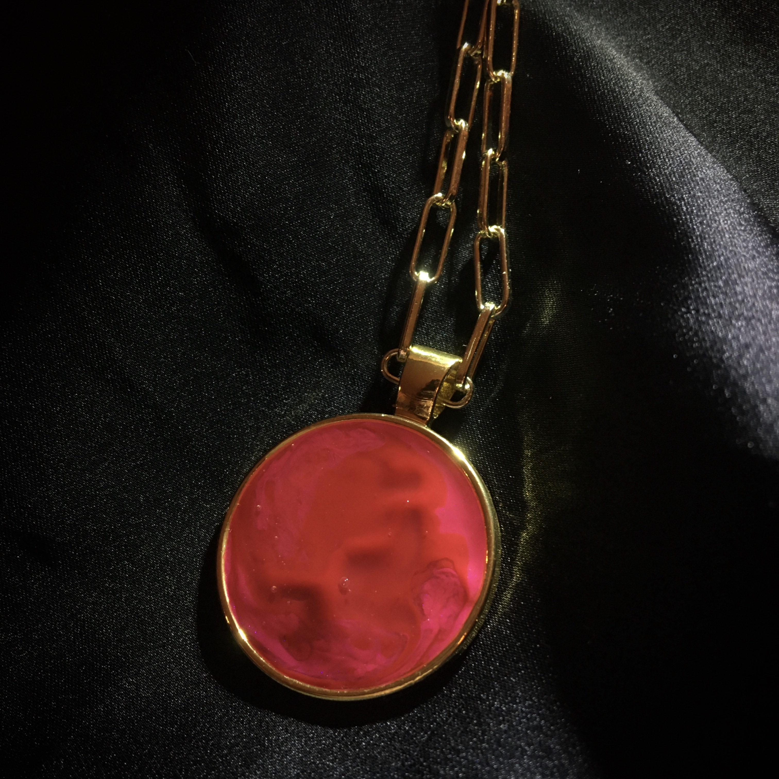 A golden bezel is filled with a hand sculpted berry colored burst, hardened with UV to form a glassy surface! This one of a kind pendant dangles upon a 16 inch 14K gold plated squared chain! Choker necklace style!