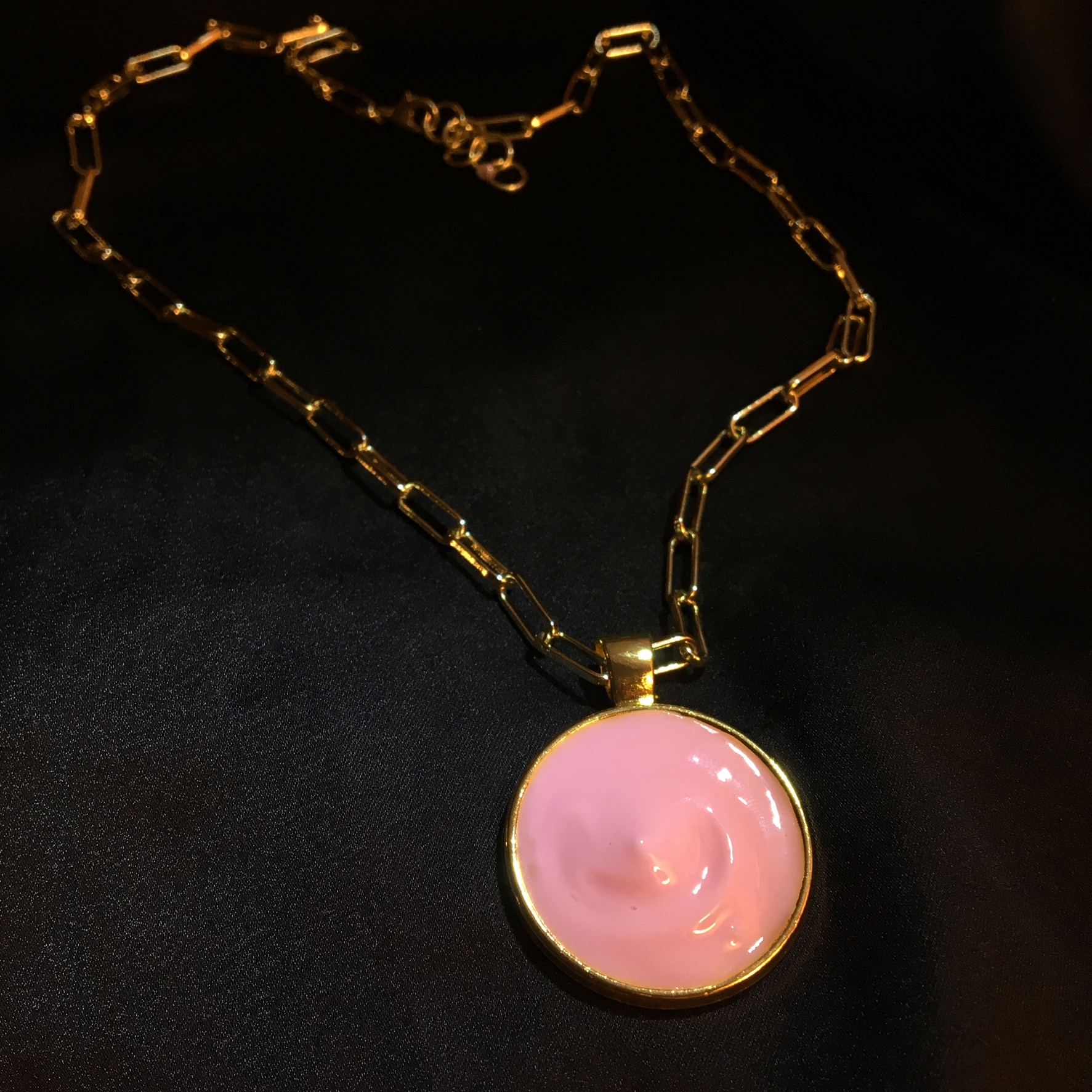A golden bezel is filled with a hand sculpted soft pink colored swirl and cured to harden with UV light to form a glassy surface! This one of a kind pendant dangles upon a 16 inch 14K gold plated squared chain! Choker necklace style!