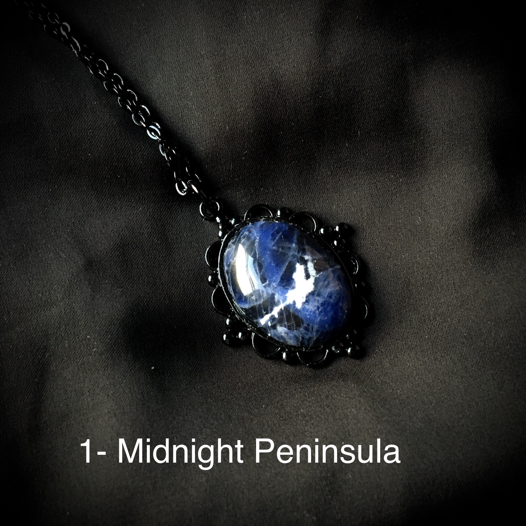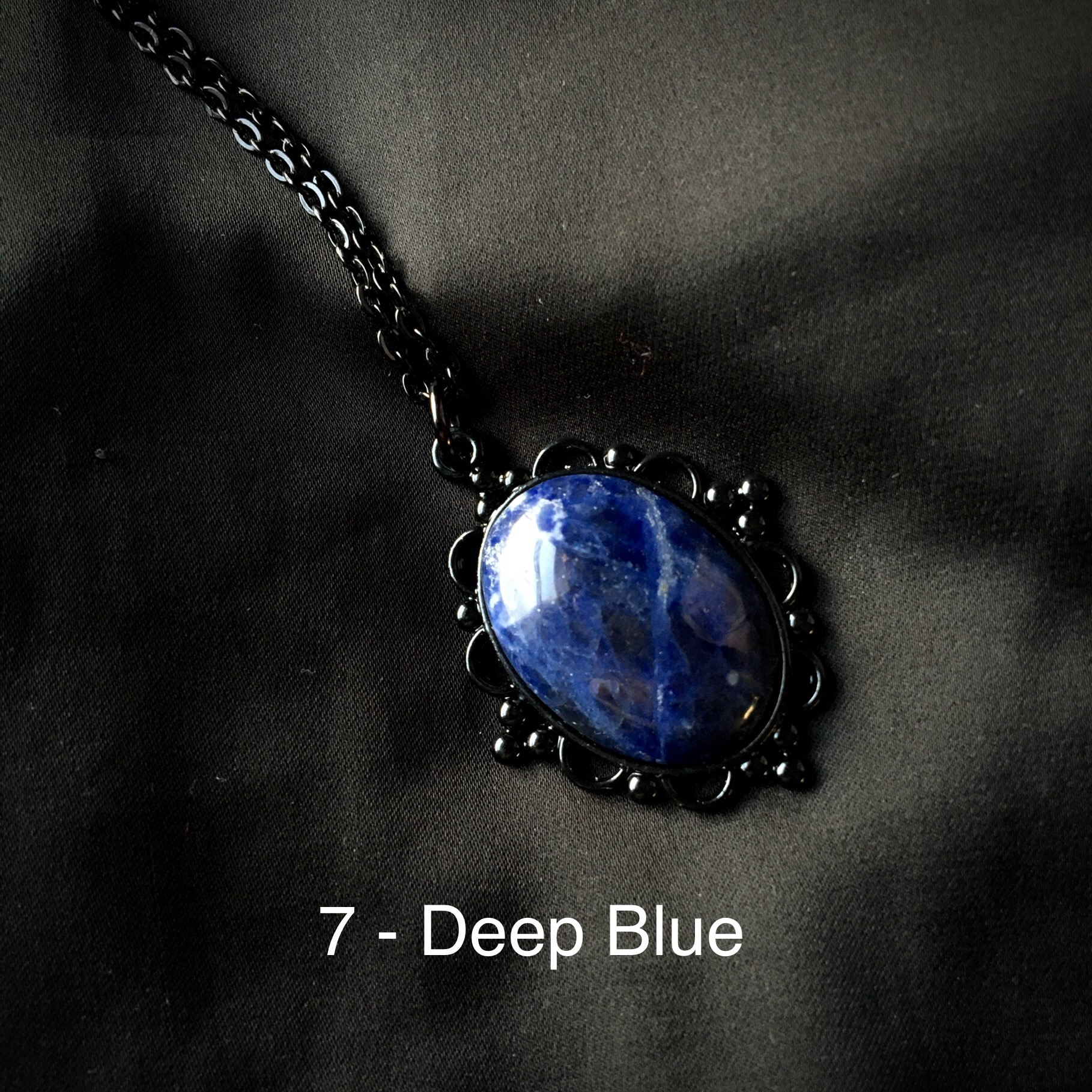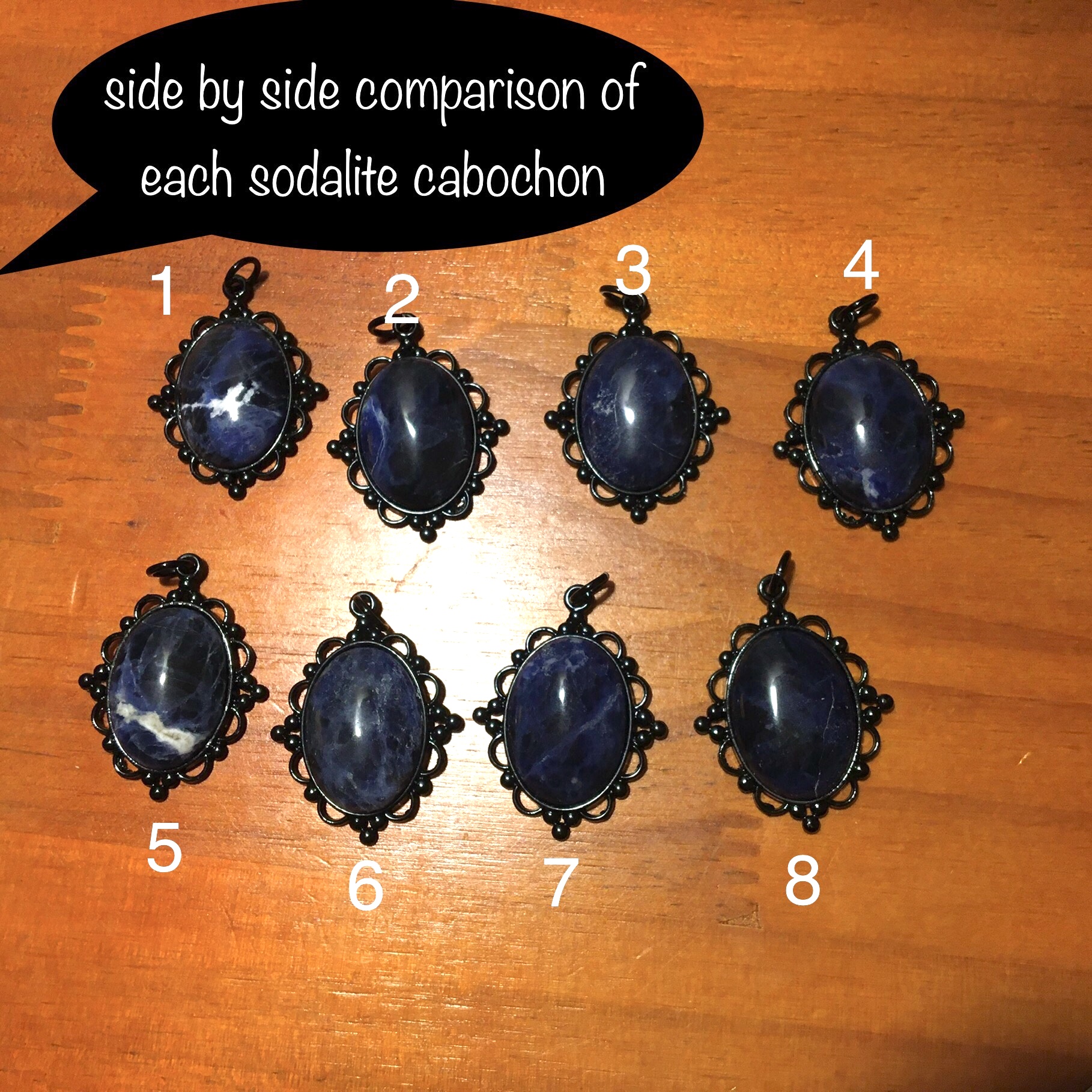 Choose which sodalite pendant you would like from the drop down menu and write in the checkout notes whether you would like a black cord or black enameled chain♡