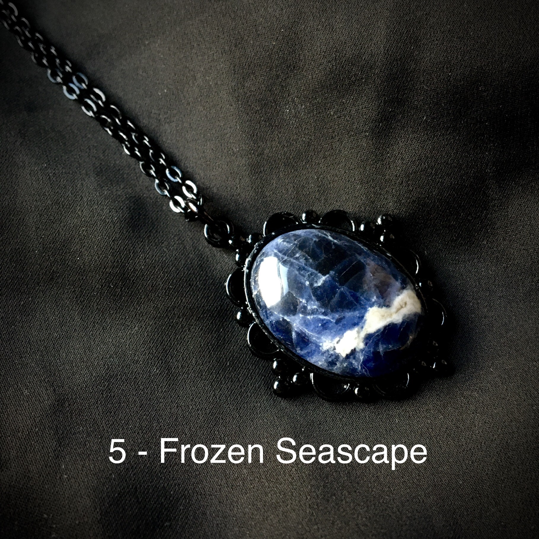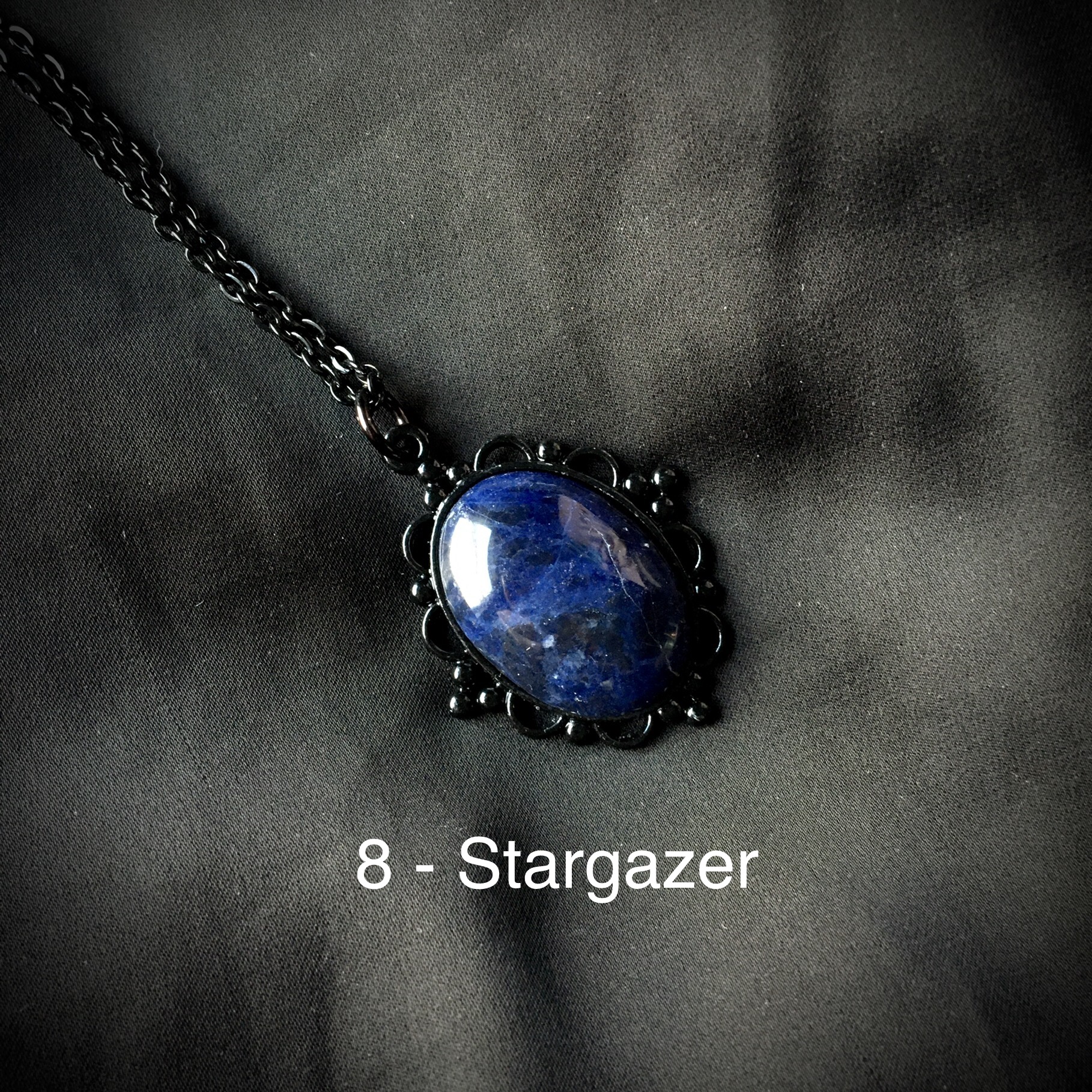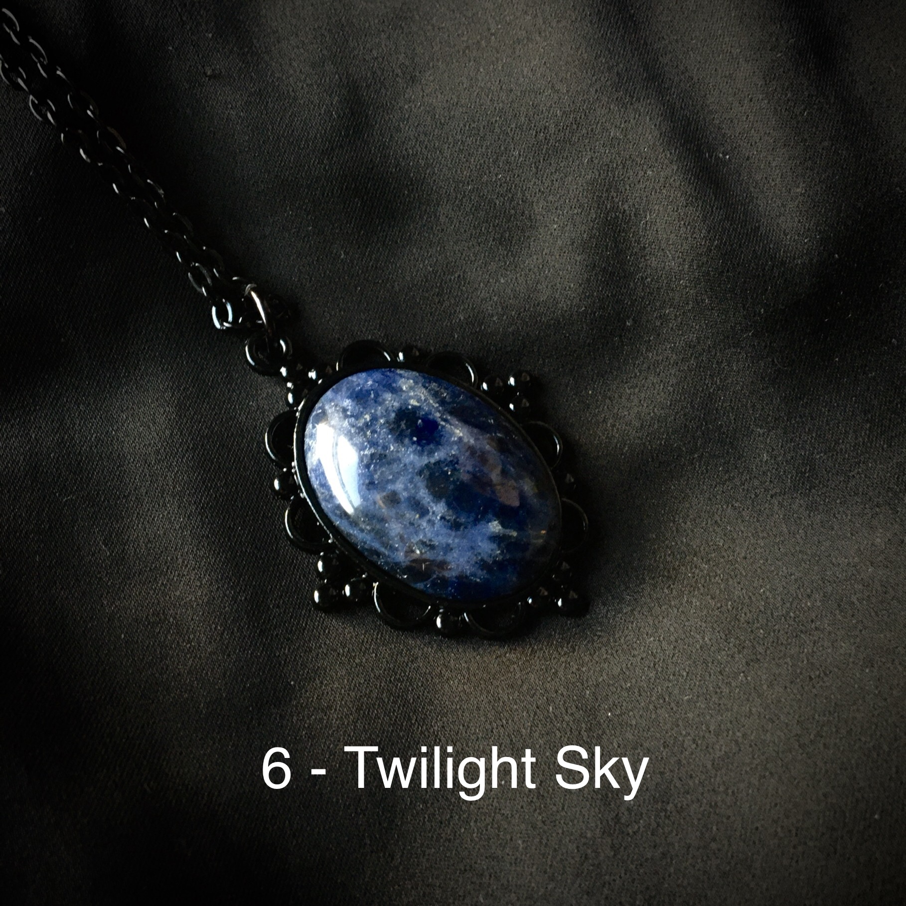 Choose which sodalite pendant you would like from the drop down menu and write in the checkout notes whether you would like a black cord or black enameled chain♡