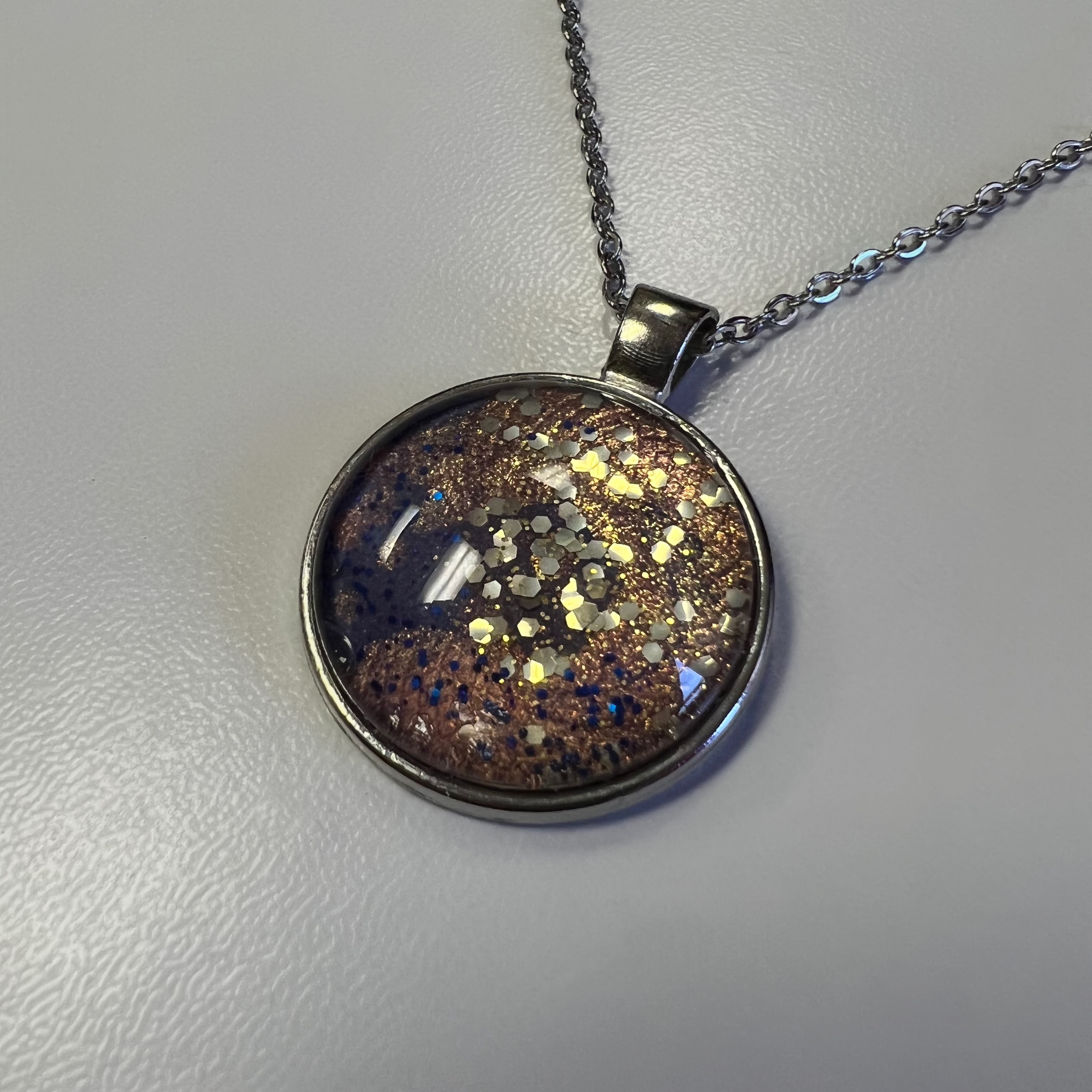 A one of a kind, hand-painted pendant necklace with circular silver bezel, cable chain, and lobster clasp closure.