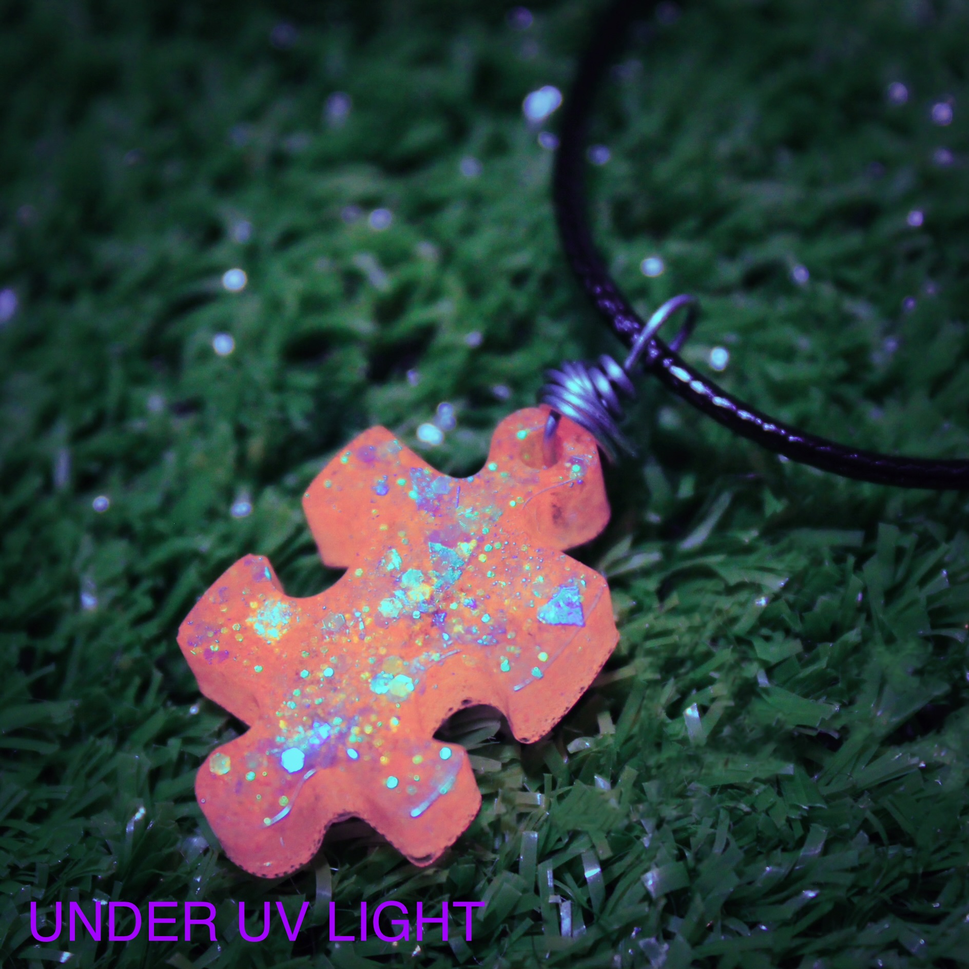Approx 3/4 inch glittery orange resin pendant. Handcrafted and absolutely one of a kind considering that no two pieces come out exactly alike! Wrapped by hand in silver wire and hung upon an 18 inch black cord. The glitters incorporated within the pendant also reflect in beautiful neon when under UV light!