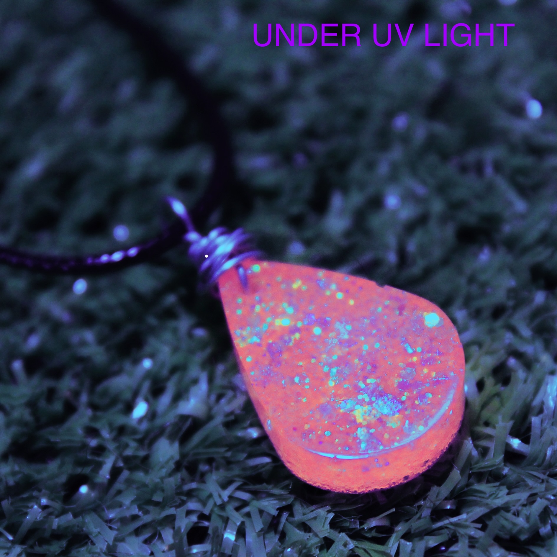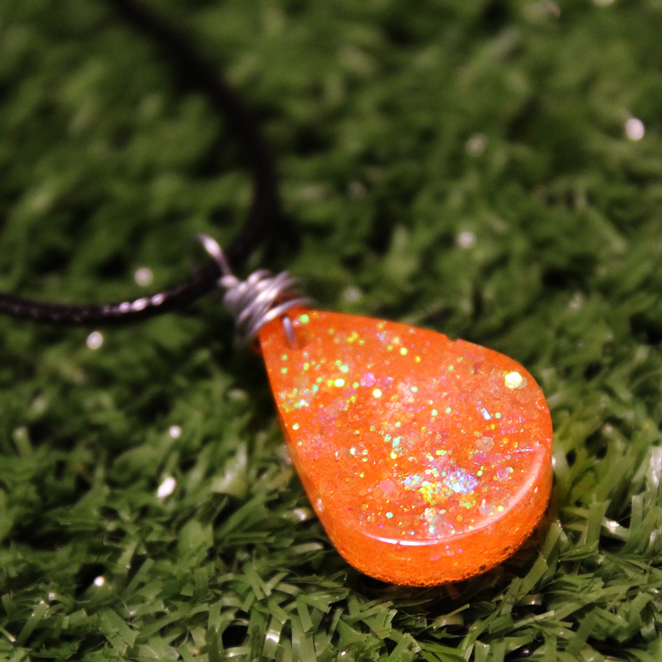 Approx 3/4 inch glittery orange resin pendant. Handcrafted and absolutely one of a kind considering that no two pieces come out exactly alike! Wrapped by hand in silver wire and hung upon an 18 inch black cord. The glitters incorporated within the pendant also reflect in beautiful neon when under UV light!