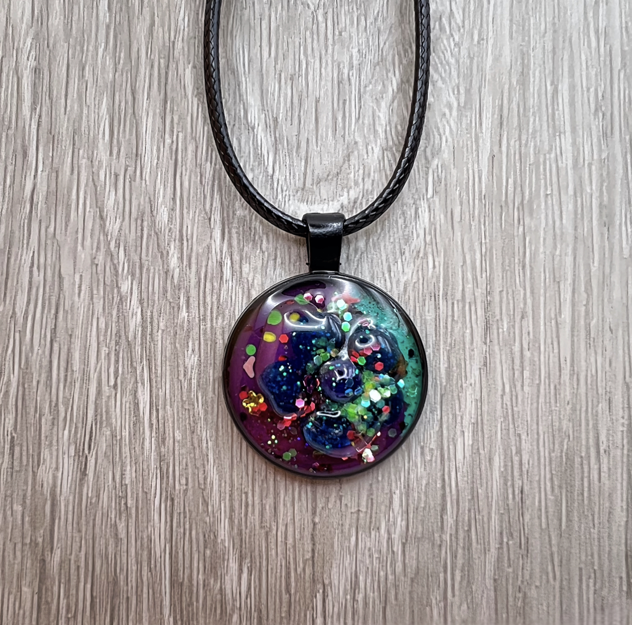 This glittery resin pendant was sculpted into a dainty flower encapsulating many vibrant colors! It is 3 dimensional and surely like nothing else in your current jewelry collection!