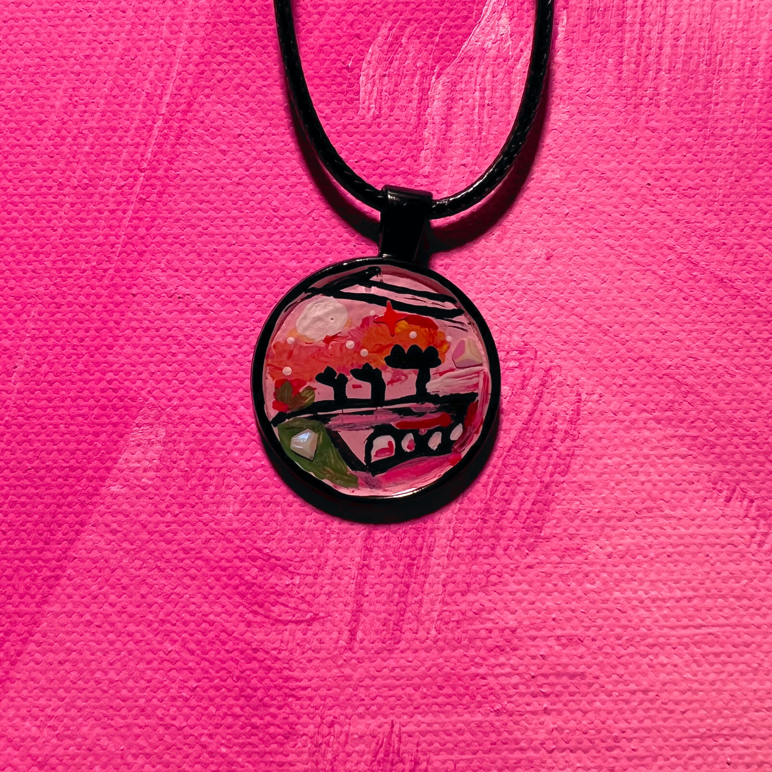 This painted pendant was made with acrylic paints and sealed with resin. Cured by UV light to finish this unique piece. Capturing a sunset view under the city freeway.