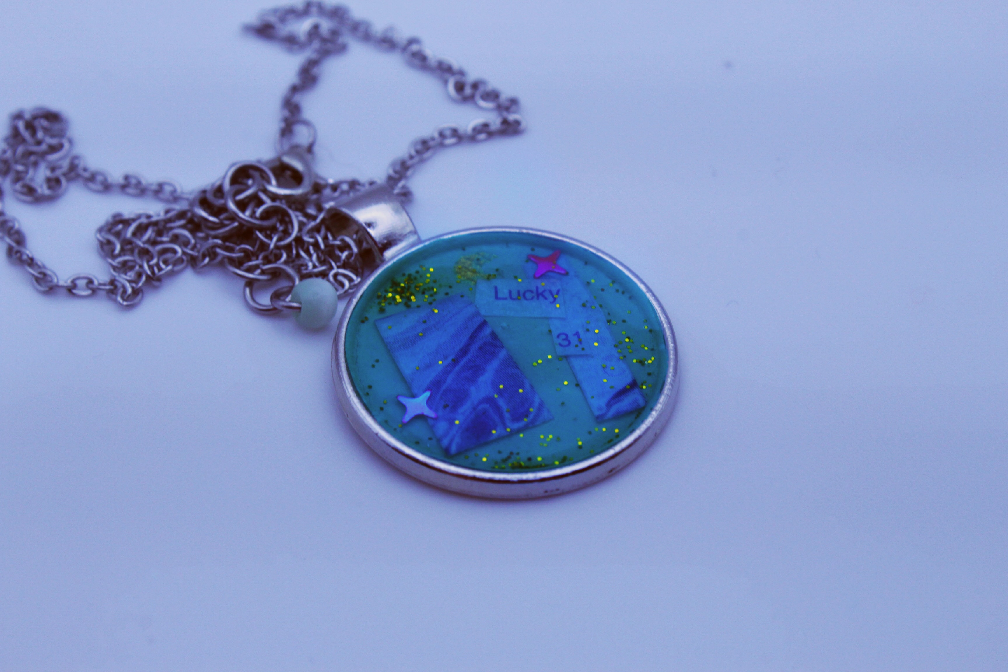 So you're one of the lucky ones? This teal painted pendant features the words of affirmation, "lucky 31" an ode to good fortune and magic. Hark! The spirited season. Embrace your inner magic with this one of a kind jewelry piece. Sparkling with glitters and enchanting hues of blueish-green, marked by a golden crescent moon, it is a special pendant indeed.