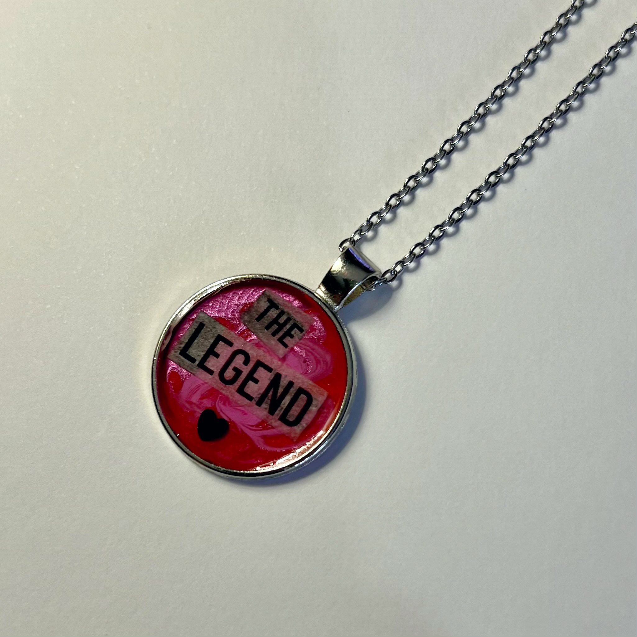 Stainless steel chain. 1 inch round pendant. Featuring acrylic paint and collage art. Painted and designed by hand.